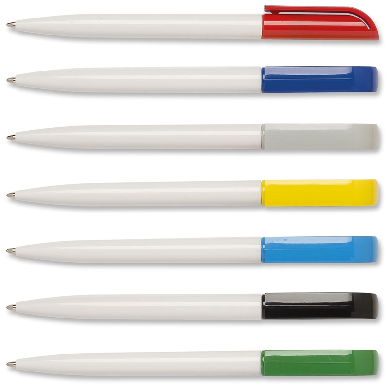 This very popular low-priced twist-action pen features a white barrel with a coloured top section and offers a large printing area on both the barrel and clip. With smooth writing for up to 2000 meters, it’s an excellent choice for promotional use.