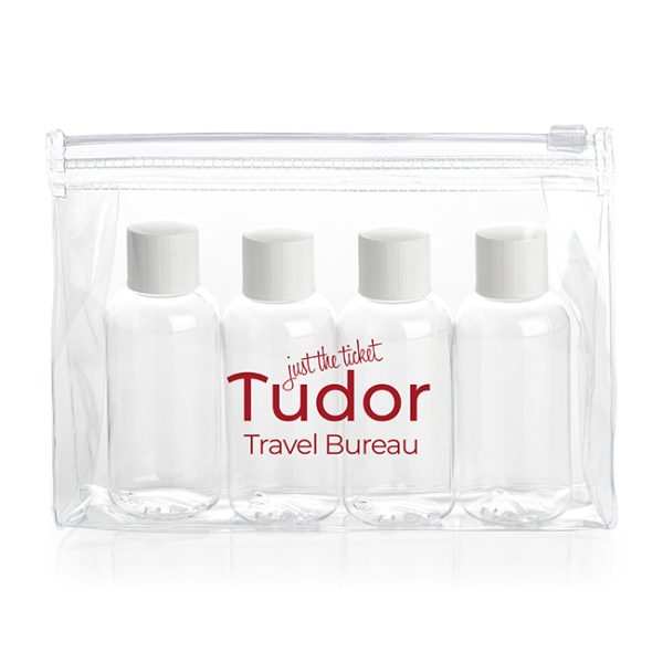 A handy sized travel set, set shown includes 4 x 50ml empty bottles in an airline suitable size clear EVA bag. Bottles labelled. Bottles made in the UK, Bags made in China. Prices are based on branding to the bag only 1-colour, contents can be branded at an additional cost.