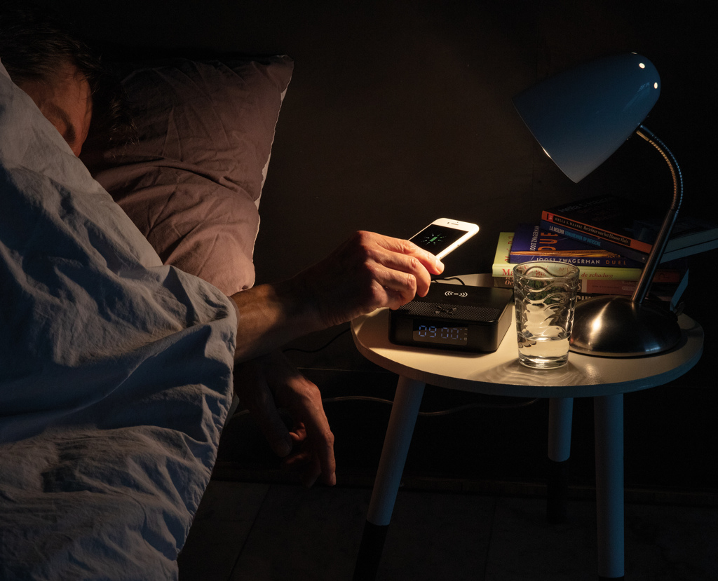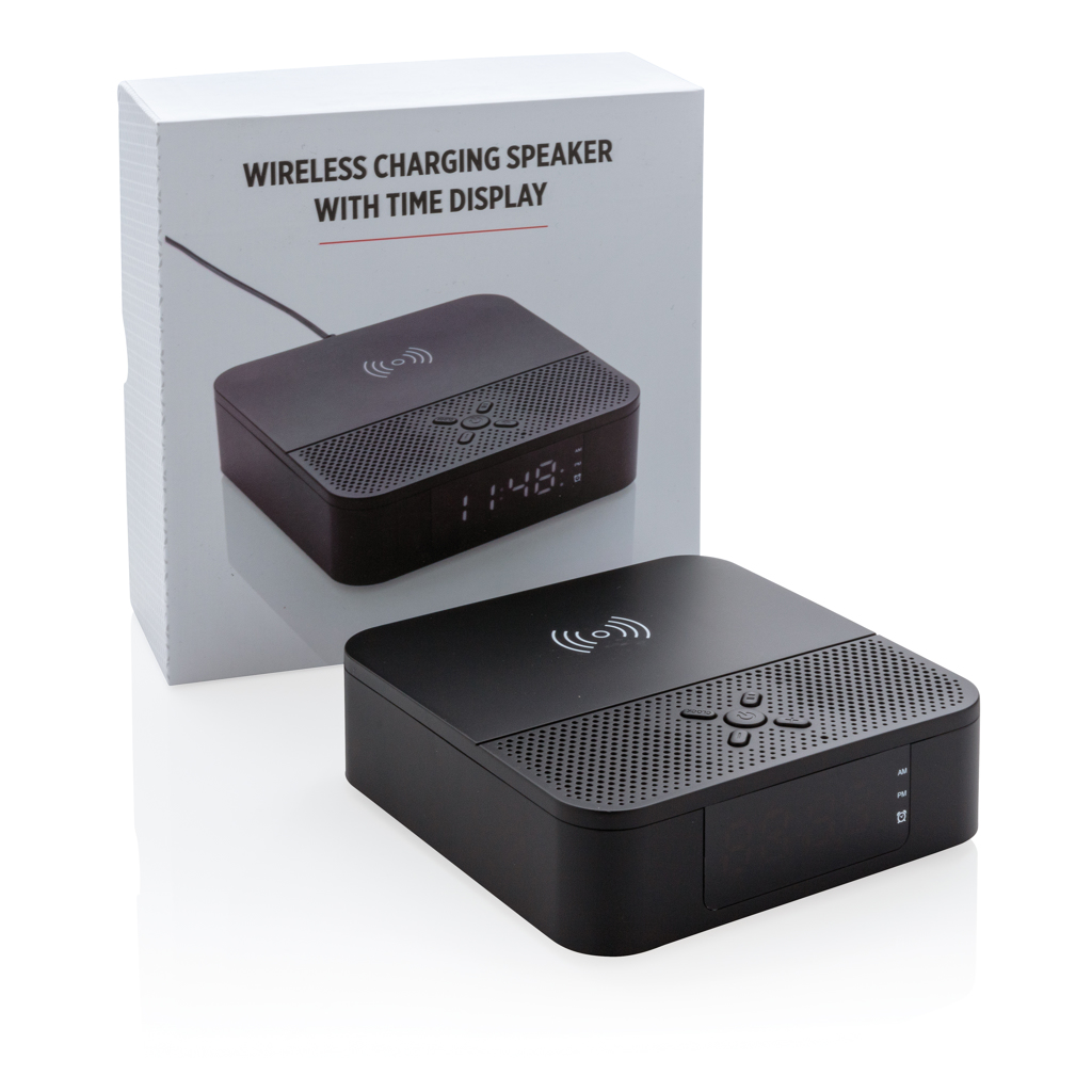 Modern wireless speaker with integrated wireless charging pad and alarm clock function. The wireless speaker has 2x3W speakers to produce a great sound.