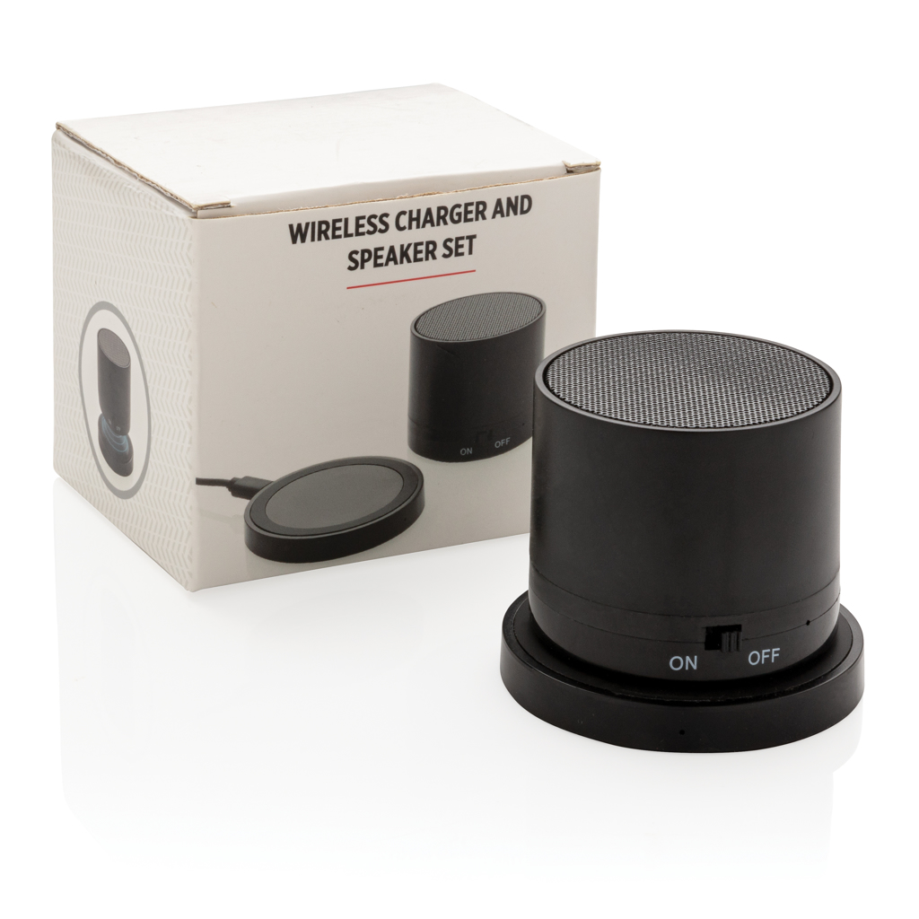 Modern gift set including 3W ABS material wireless speaker and 5W wireless charger. The wireless charger can be used to re-charge the speaker but is also suitable to charge your mobile device.