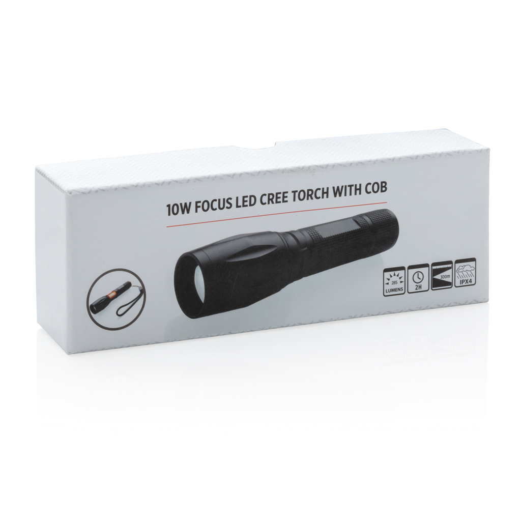 Aluminium 10W CREE torch with integrated COB light and polyester wrists strap. The CREE LED provides 285 lumen with a beam up to 300 metres.