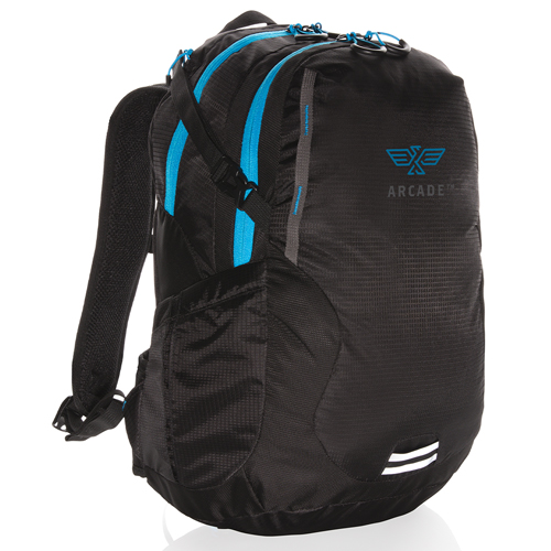 Carry and protect your items inside this sporty backpack. The medium hiking backpack is made from ribstop fabric and features a medium sized shape with interior and exterior storage pockets and a mesh back padding that makes it comfortable to carry. This backpack has a roomy main compartment with a sleeve pocket to hold your 15.4 inch laptop. The integrated rain cover will protect your bag from rainfall. Contrast details add a splash of colour and a touch of sporty style to the overall design. PVC free.