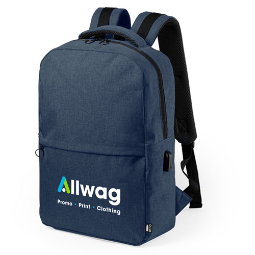 Business backpack in resistant 600D RPET material, obtained from recycled plastic materials, to encourage the reusing of plastic residues and contribute to the Earthandrsquo;s sustainability. With double puller zipper pocket and front pocket. Inside compartment with padded pockets for tablet up to 10 inches size and laptop up to 15 inches size, including USB connection for mobile devices charging (cable included, auxiliary battery not included). Reinforced corners and accessories in black colour. With padded back and adjustable, padded, shoulder straps. RPET distinctive in label.