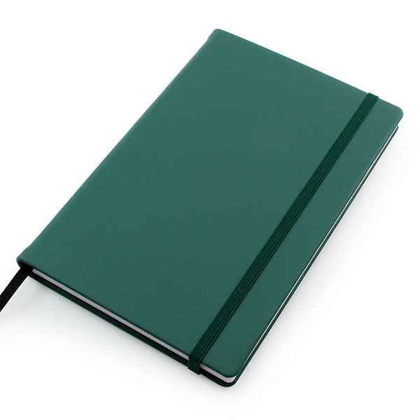 A5 Casebound Notebook with Elastic Strap with a soft touch vegan cover with a subtle two tone effect, available in 20 colours. This material darkens when debossed to make your branding really distinctive but can equally be printed.