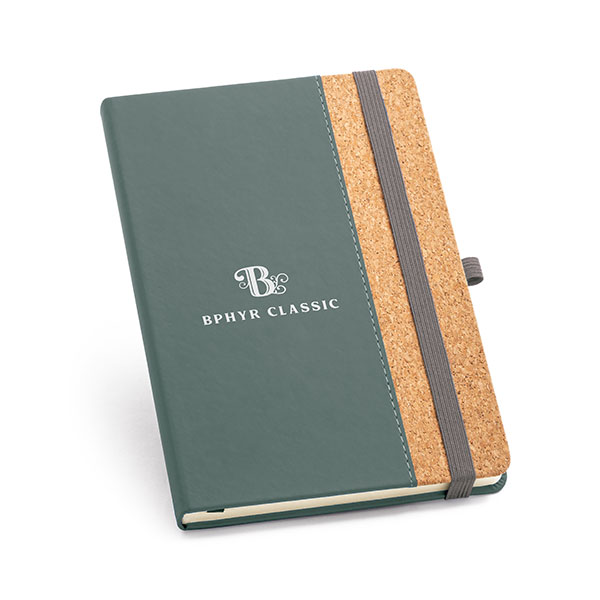 A5 notepad with cork and PU hardcover. Elastic band, bookmark ribbon and elastic pen loop. 96 sheets of lined ivory 70 gsm paper. The paper used in this product is from responsibly sourced wood from sustainably managed forests. Supplied in a pouch.