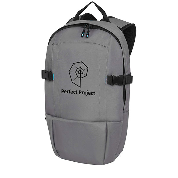 Sustainable GRS certified RPET laptop backpack made with 50% recycled materials. Features a large zippered main compartment with a padded 15in laptop sleeve with velcro closure, a hanging hook, and a front vertical zippered compartment. Comes with additional straps with buckle closure for safety, comfortable padded shoulder straps, grab handle, mesh back with a zippered pocket and expandable mesh side pocket.