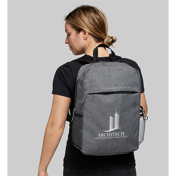 Hoss 15 inch laptop backpack. Capacity 18 litres. Dyed 300D polyester fabric. Large zipped main compartment. 15 inch laptop pocket. Front zipped compartment. Padded shoulder straps and grab handle. Mesh water bottle pockets. Bulked pack in cartons of 35pcs. Carton weight: 13KG.