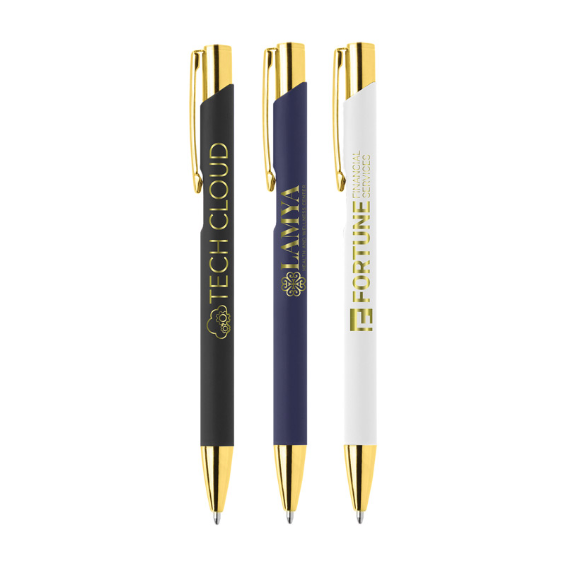Introducing a fabulous new member of the Crosby family The Crosby Gold Soft-Touch is a premium soft-touch ballpoint pen with a tactile rubberised barrel and striking gold coloured trim. Supplied Laser Engraved to reveal a beautiful gold mirror finish. Available with blue or black writing ink and in a range of 6 classic colour options.