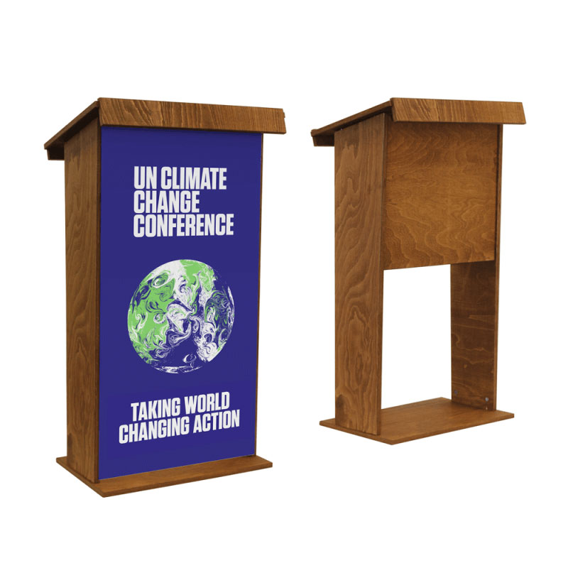 This Wooden Lectern has a simple design that is both practical and stylish. It's designed with an integral storage shelf and a poster gripper at the front for you to display relevant graphics and branding. Additionally, it features a microphone holder slot, which also can be used to pass light fixtures and wiring through, making it great for use in restaurants and presentations.