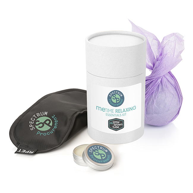 A handy little Me Time Relaxing Essentials Kit in a cardboard tube that includes a sleep balm, sleep mask and a natural bath bomb. Prices are based on branding to the tube only, contents can be branded at an additional cost.