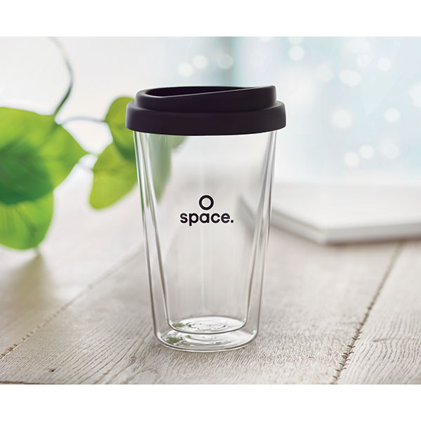 Bielo tumbler. Capacity - 350ml. Made from borosilicate glass. Double walled construction. Silicone sipper lid. Dishwasher and microwave safe. Supplied in white midocean box. 40 per carton, carton weight 11.68kgs
