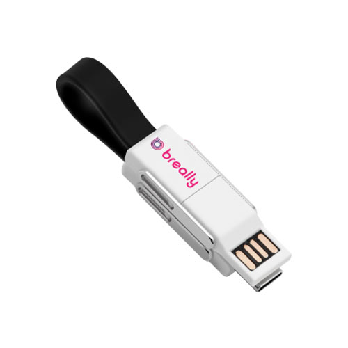 4-in-1 impressive multifunctional charging and sync cable from Chili Concept. This clever product opens out to reveal the 4 charger heads including micro USB, USB-C and lightning connector and folds to make a compact and highly portable product with keyring attachment. Available in a choice of black or white, with spot or full colour printing to the body.