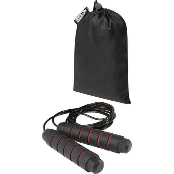 Skipping rope. 310cm length rope with shaped foam handles. Supplied with an rPET storage pouch. Individual gift pouch. Bulk packaging 72 pc, 13 kg.