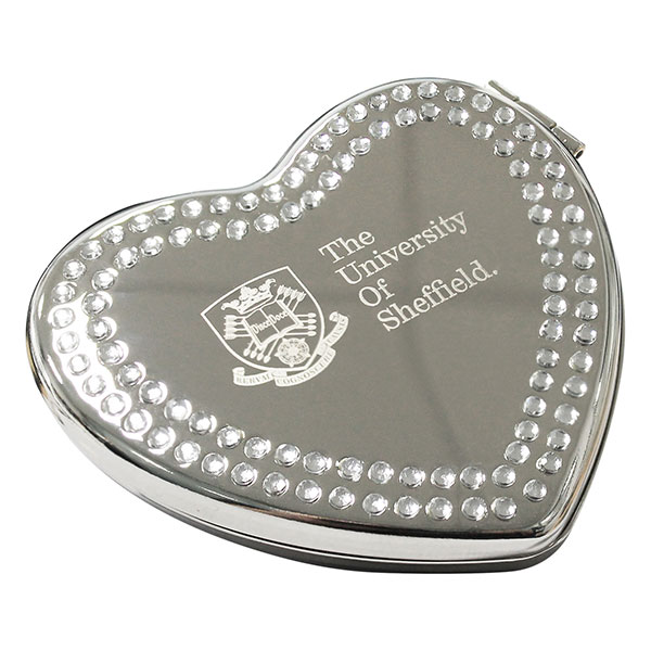 Bravado heart vanity mirror .Polished nickel plated finish.Decorated with 2 rows of small crystals to the front.2 inner mirrors one of which is slightly magnified.Supplied individually boxed. Inner/Outer quantities: 70.Eco packaging Recyclable box.