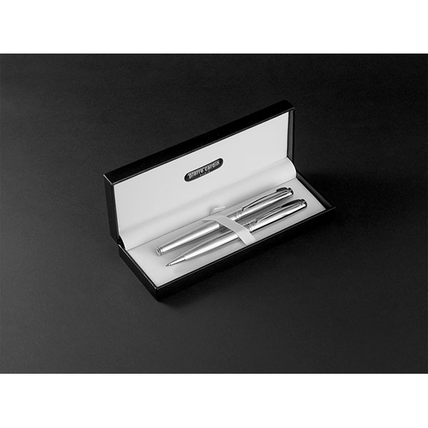 Pierre Cardin Lustrous chrome ballpen and pencil set. Polished brass casing triple-plated with chromium. 0. 7mm lead twist action mechanical pencil. Twist action metal ballpen. Dokumental ink refill. Ink colour: Black. Supplied in Pierre Cardin gift box. Supplied in Pierre Cardin PB17 gift box. If bulk packed. packaged in outer cartons of 200 units.