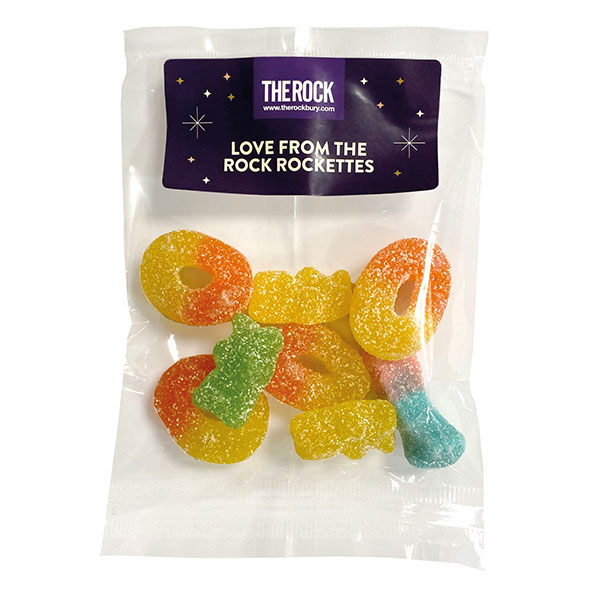 Vegan sweet bag. Clear bag . Containing 50g of vegan sweets. Bulk packed . Eco packaging-card outer casing