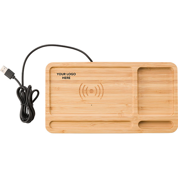 Bamboo desk organiser with wireless charging. 5W charging function. Output: 5V/800mA. Includes USB charging cable.