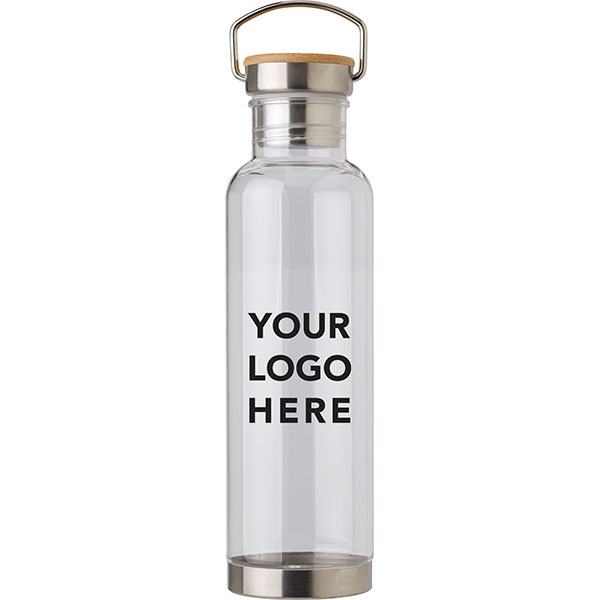 Transparent Tritan bottle. Brush steel trimmed base with bamboo trimmed screw lid and metal loop. Capacity: 800ml.