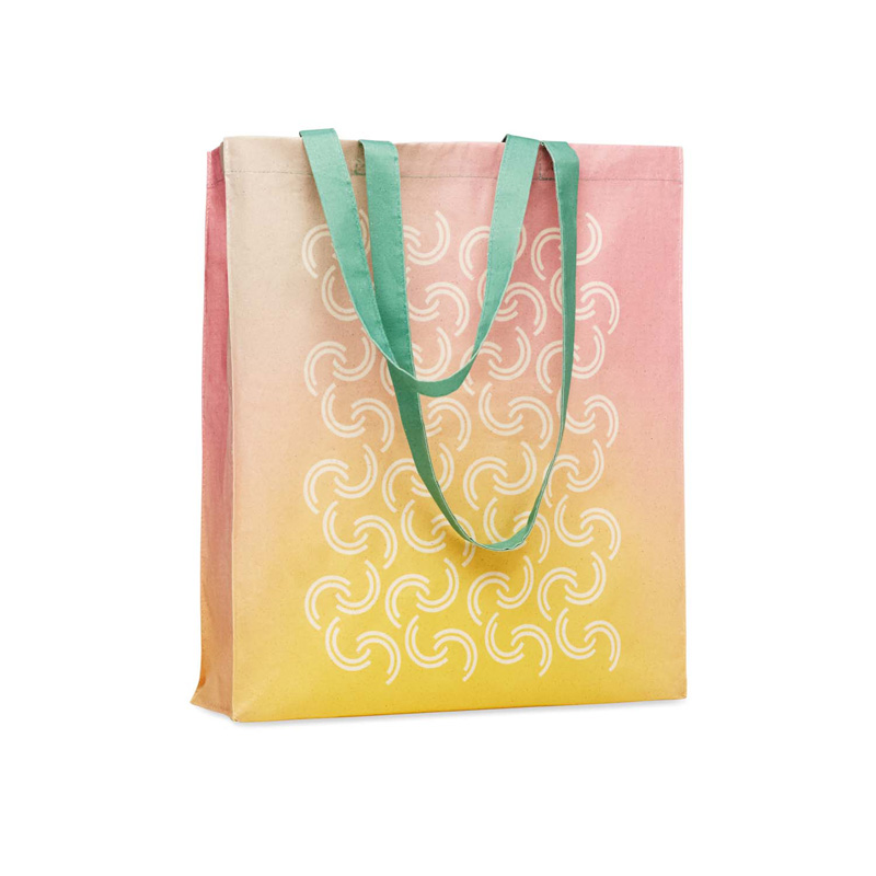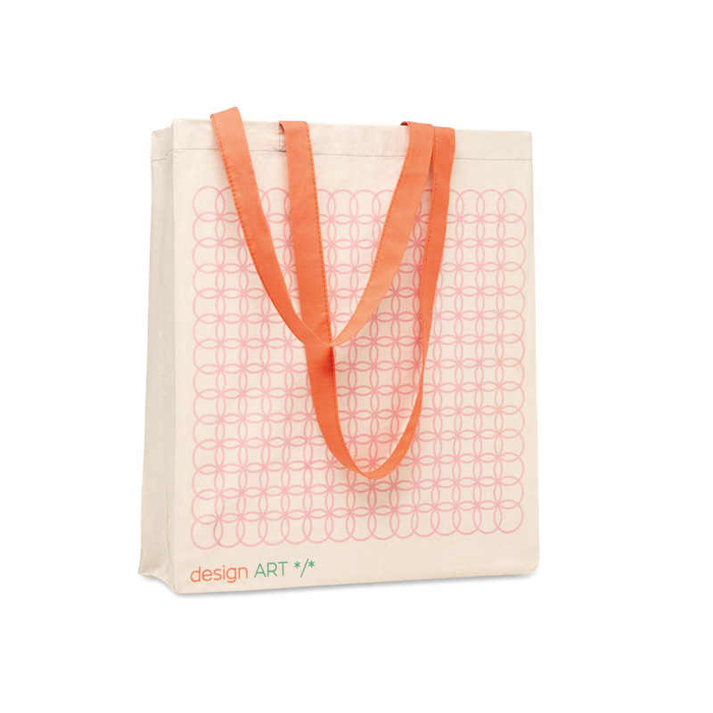 Recycled pre-consumer cotton bag with gusset and long handles.
