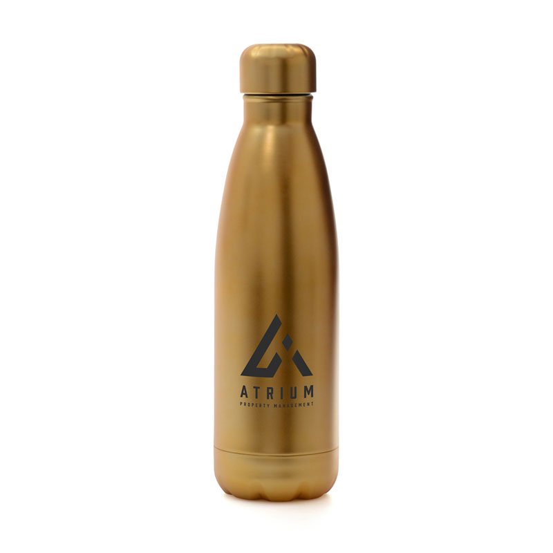500ml double walled stainless steel drinks bottle with a brushed matt gold finish, screw on lid with PP plastic inner and silicone seal. BPA & PVC free. Product can be printed up to 2 spot colours, engraved or digitally printed.