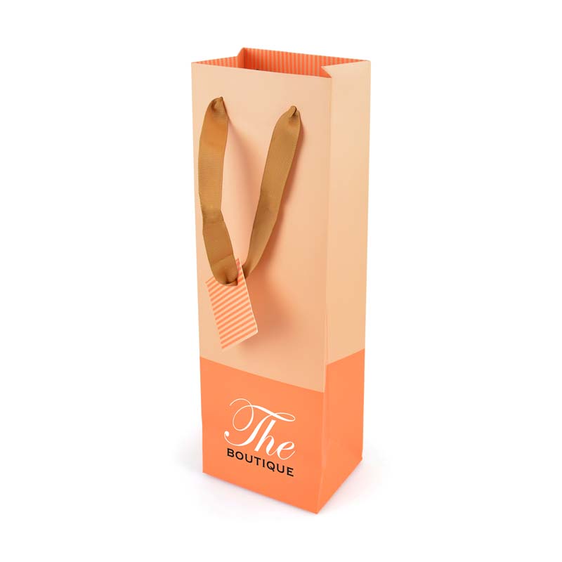 Matte laminated 200gsm wine bag with coloured stripe, ribbed ribbon handles and striped coloured gift tag.