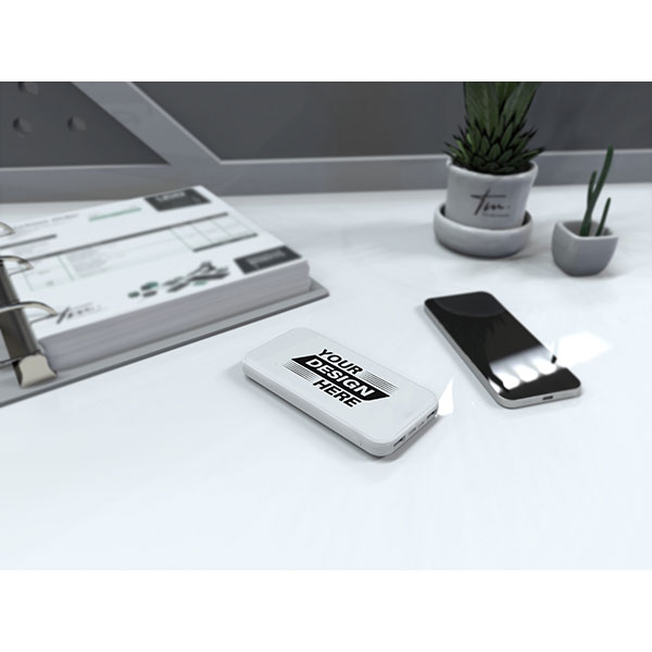 Indus Blade powerbank. Capacity - 3,000 mAh. Standard housing/trim colours of black or white. Input/Output - 5V/2A. Supplied with USB cable. Made from RCS certified recycled ABS plastic. Individually boxed into a kraft tuck box. 45pcs per ctn / 30.6 x 22.6 x 30cm / 10kg per ctn