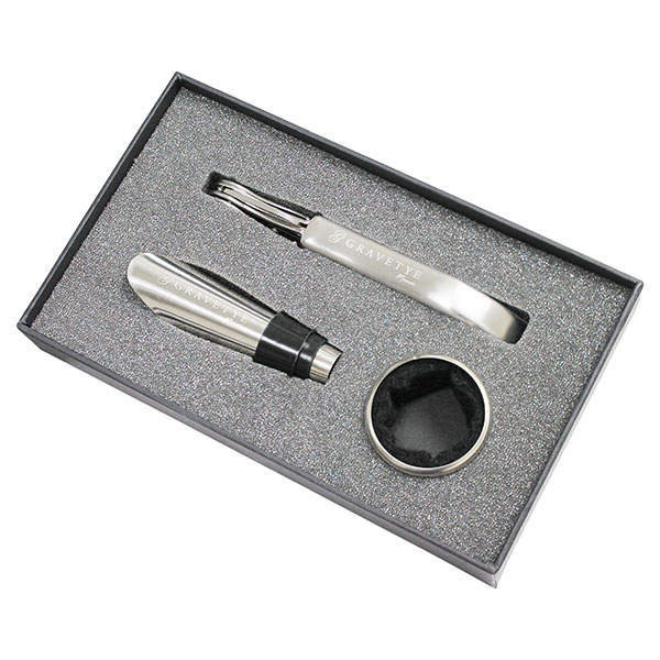 Bravado Bordeaux wine set.Professional corkscrew. wine collar and wine pourer.Supplied in a gift box. Box is fully recyclable and made from recycled pulp.Gift boxed.Inner/Outer quantities 100