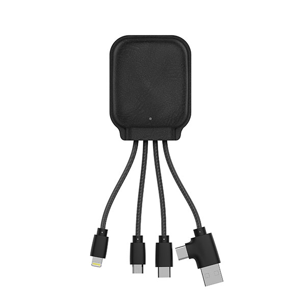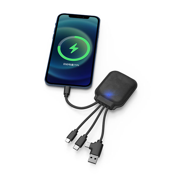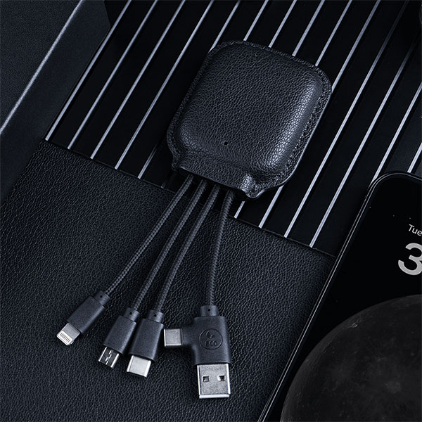 Xoopar Ine Gamma hybrid cable. Recycled bonded leather 3000mAh powerbank. Hybris power bank and charging cable for an instant charge. Compatible with most devices. Adaptors include Lightning. micro USB. Type C and combined Type C/USB. Capacity: 3000mAh. Built in cable. lithium built in 3000mAH batteries included. Individual packaging ? Yes card sleeve. Inner/Outer quantities 100 pcs. Eco packaging FSC card .