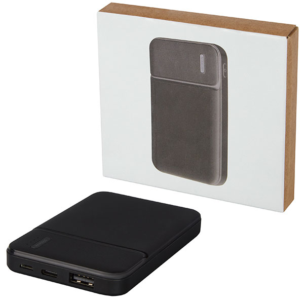 Loop recycled powerbank. Capacity - 5,000 mAh. Made of RCS certified recycled ABS plastic. Rechargeable. Features power indicators. Type-C input 5/2A, micro USB input 5V/2A, USB output 5V/2A. Supplied in a gift box. Delivered in gift box with an instruction manual (both made of sustainable material). 60 pieces per carton. 8kg per carton.