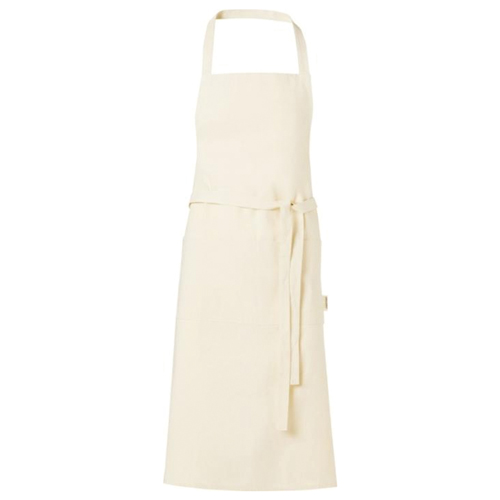 Sustainable apron made of 200 g/m organic cotton. Features 2 adjacent pockets with a combined size of 45 x 20 cm, and a 1 metre tie back closure. Length of the neck strap: 55 cm.