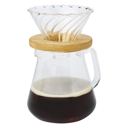 High-temperature-resistant glass espresso coffee maker with a capacity of 500 ml. The filter can be separated. Works with filter paper. The bamboo holder is from sustainable, environmentally, and socially responsible sources.