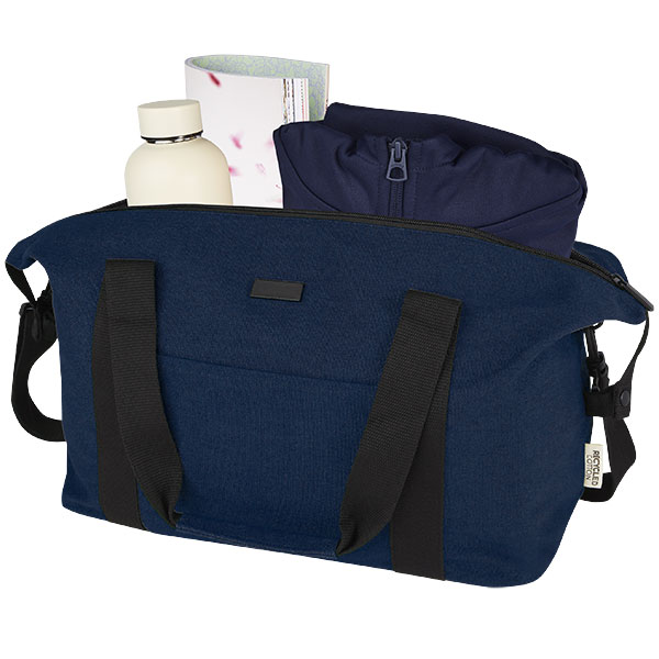 Joey sports bag. Capacity: 25 litres. Made from GRS recycled canvas and GRS rPET lining. Zipped main compartment. Inner zipped pocket. Open front pocket and zipped trolley sleeve. 2 reinforced webbing carry handles. Detachable and adjustable shoulder strap.