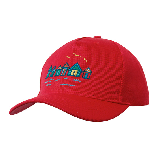 American twill peak baseball cap. 5 panel, pre-curved peak fabric covered short touch strap.