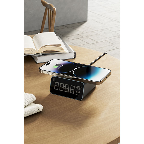 Xoopar Reddi charge. Fast charging wireless charger with alarm clock. Made from recycled aluminium and recycled plastic. GRS certified recycled materials. Individual packaging - Card box. Inner/Outer quantities - 50pcs. Eco packaging - FSC Card