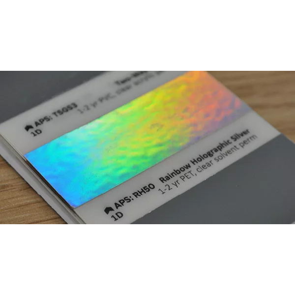 Stickers in bright holographic rainbow silver polyester with permanent adhesive.