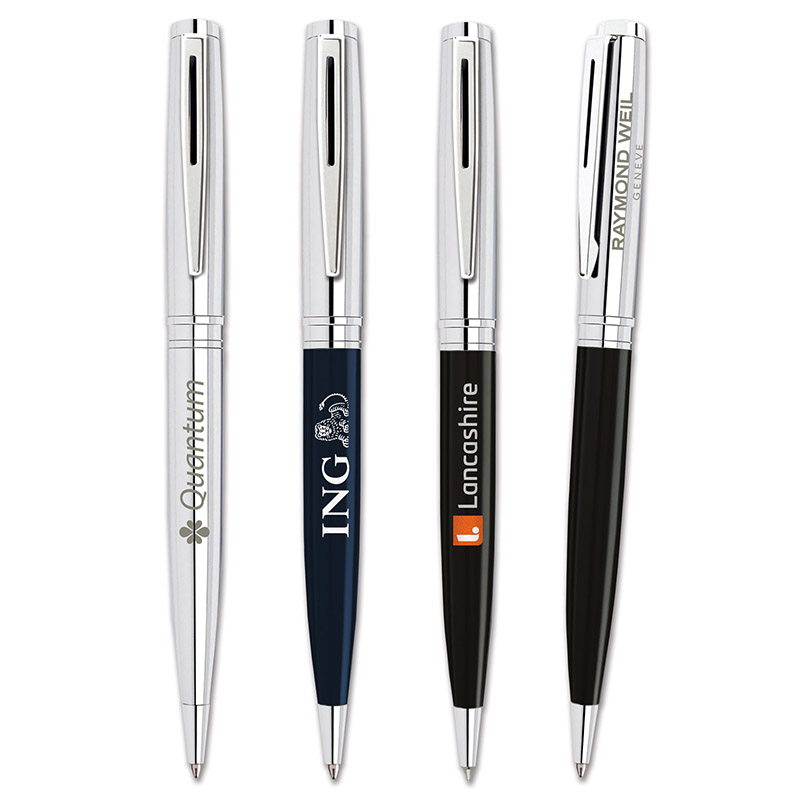 Stylish high quality twist action ballpen in bright chrome and gloss lacquered black or midnight blue with bright chrome styling. Fitted with a high quality German made Parker style black ink refill.