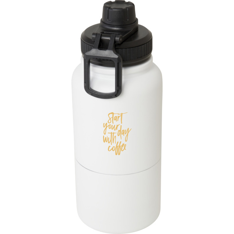 Multi-use, RCS certified stainless steel insulated bottle with a removable storage container. The top part of the bottle features a copper insulated thermos that has a volume capacity of 530ml, and keeps drinks hot or cold for several hours. The bottom part is a double-walled container that can hold up to 340ml. It can be used as a cup for your favourite cold beverages, or to store snacks or other small items. Presented in a recycled cardboard gift box.