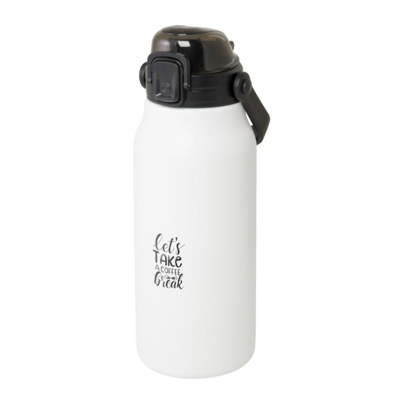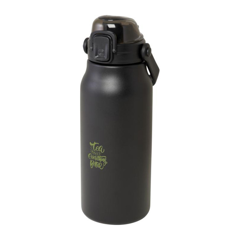 This large RCS certified recycled stainless steel bottle will keep you hydrated throughout the day in style. The copper vacuum insulation will keep drinks hot or cold for several hours, and the with its folding handle it is easy to carry around. The bottle is leakproof and features an easy button opening mechanism. Volume capacity is 1600ml. Presented in a recycled cardboard gift box.