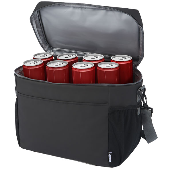 Aqua 20 can GRS recycled water resistant cooler bag. Capacity: 22 litres. Features a zipped compartment lined with thermal PEVA and foam insulation. 2 mesh pockets and one open front pocket. Webbed carry handle and the adjustable and padded shoulder strap.