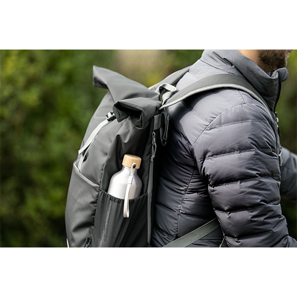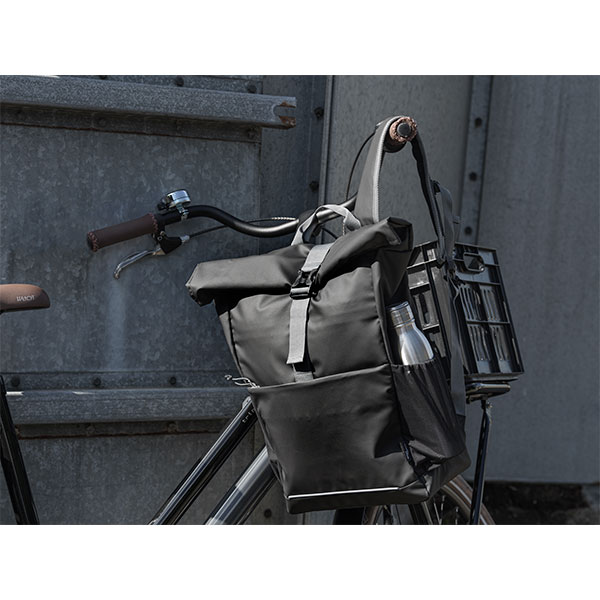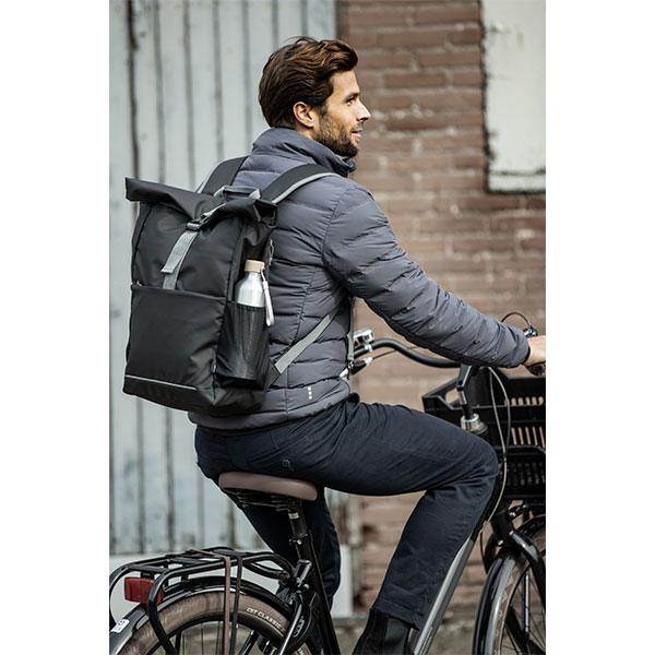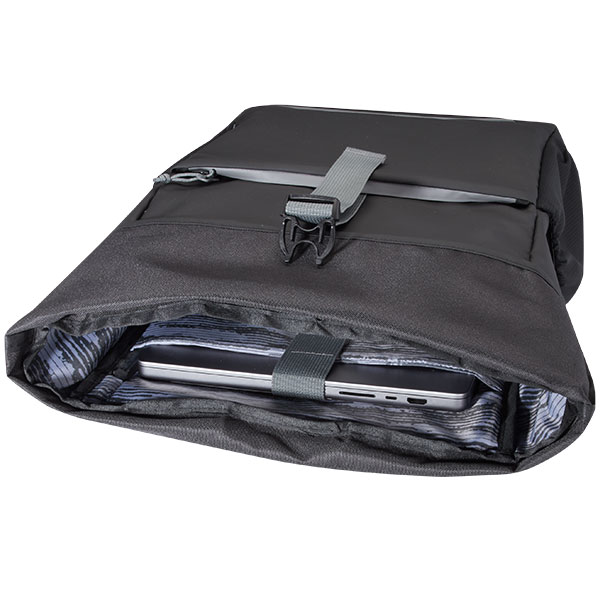 Aqua 15" GRS recycled water resistant roll-top bike bag. Capacity: 20 litres. Features a padded 15" laptop compartment, multiple organisational pockets, adjustable hook and loop closure and reflective piping for visibility.