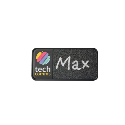Made from recycled plastic, this reusable badge features a chalkboard style with name window on the right.