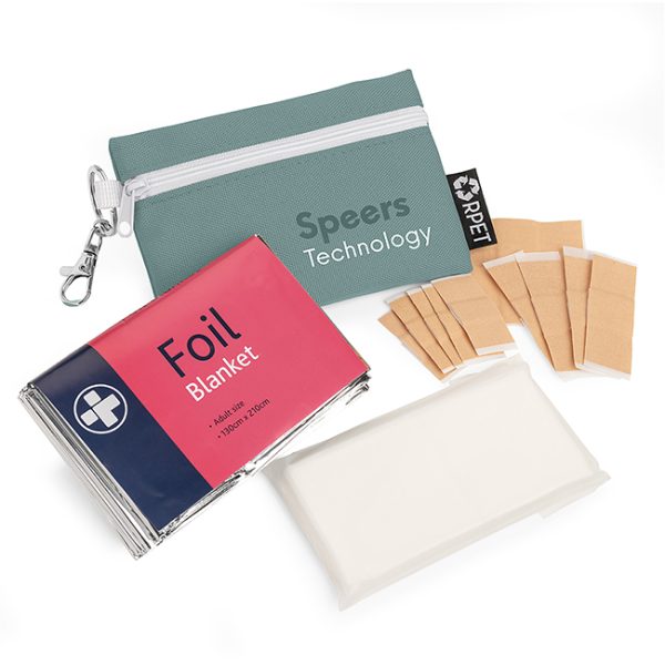 Ideal for any outdoor pursuits including walking and hiking and includes a selection of essentials such as 10 assorted plasters, tissues and a foil blanket in a full colour printed zippered pouch on a clip. Pouch made from post-consumer recycled plastic bottles RPET. Machine washable. Prices are based on branding to the pouch only, contents can be branded at an additional cost.