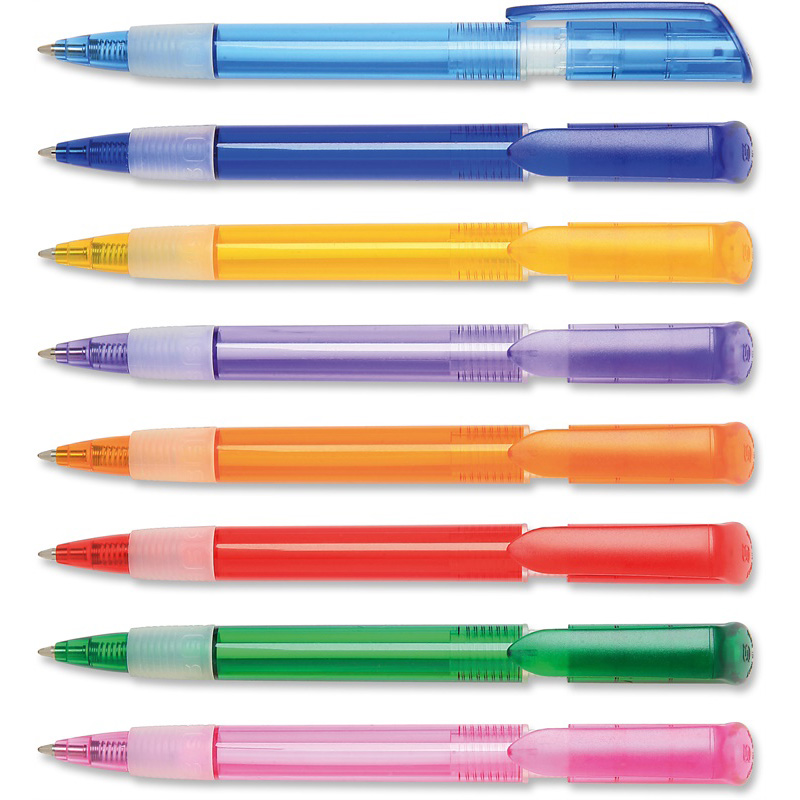 This attractive push-button plastic pen features a transparent finish and is available in a wide range of vibrant colours. It includes a clear rubberised grip for added comfort and offers over 2000 metres of smooth writing, making it a practical choice for everyday use.