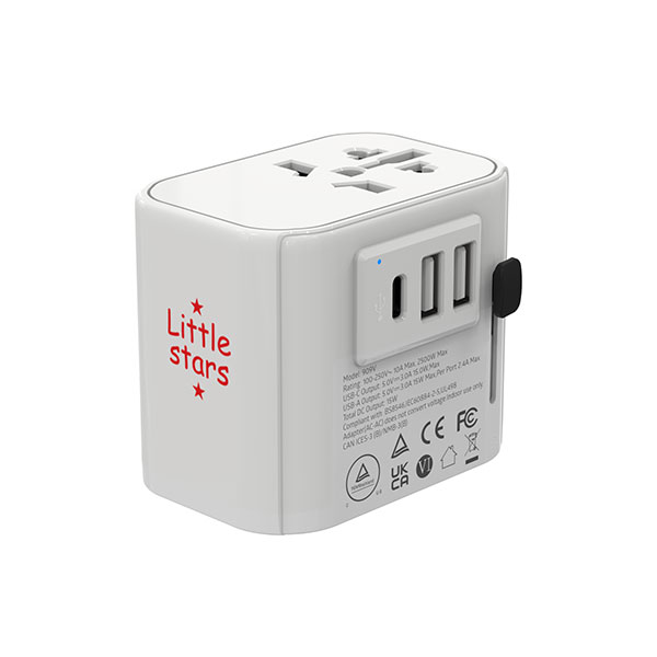Universal travel adaptor. Suitable for US, Europe, UK and Australia. 2 x USB and 1 Type-C port. Supplied in zipped case. BA8546 certified. Individually packed. Gift boxed. EVA Pouch. Inner/Outer quantities 70.