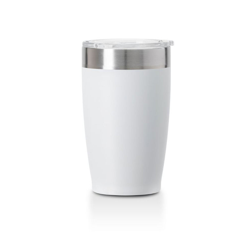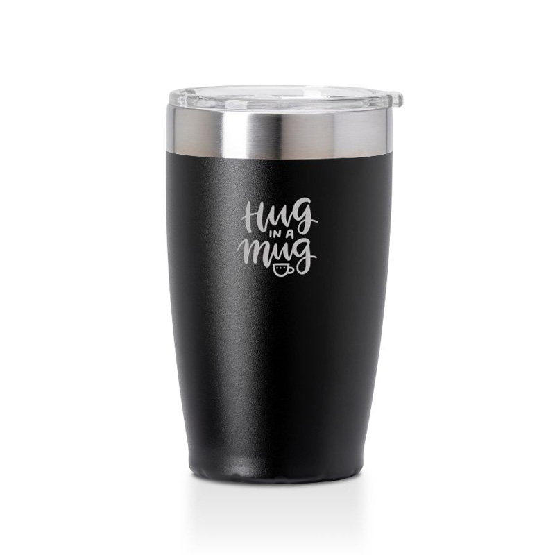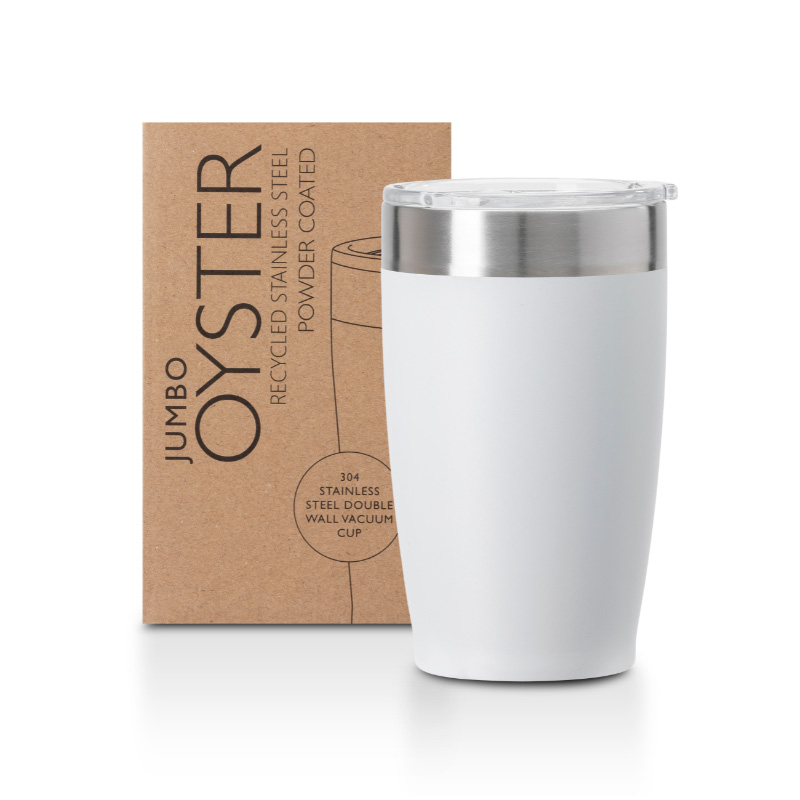 Quality recycled stainless steel, 500ml travel cup with sliding, non-spill lid and smart powder coated finish. The Jumbo cup holds the audited Global Recycling Certificate. Supplied in 100% recyclable packaging. Cups are packed in a protective, biodegradable, corn starch liner within an FSC certified tuck box.