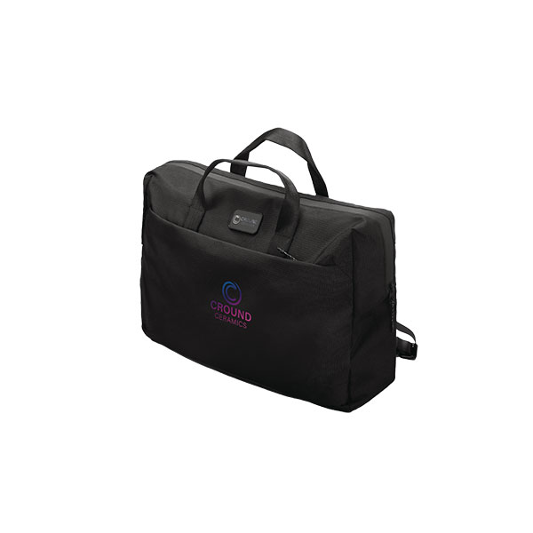 Chili Concept computer bag. Made from Waste2Gear ocean bound plastic. Main compartment designed to hold 15 inch laptops. Front pocket for accessories. Trolley strap. Adjustable padded shoulder strap.