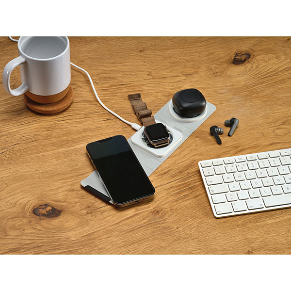 Linnaeus 3 in 1 wireless charger. Quality travel charger. 3 wireless charging pads. 3 different power levels. Supplied with Type-C cable. Individual box size 11 x 11 x 2.4 cm. Gift boxed. Inner/Outer quantities - Inner - 1 / Outer - 60. Kraft cardboard.