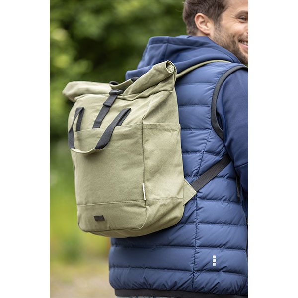 Joey roll top backpack. Capacity: 15 litres. Made from GRS recycled canvas and GRS rPET lining. Zipped rolltop main compartment with tablet sleeve. Zipped large front pocket. 2 side water bottle pockets. 2 reinforced webbing carry handles. Padded shoulder straps.