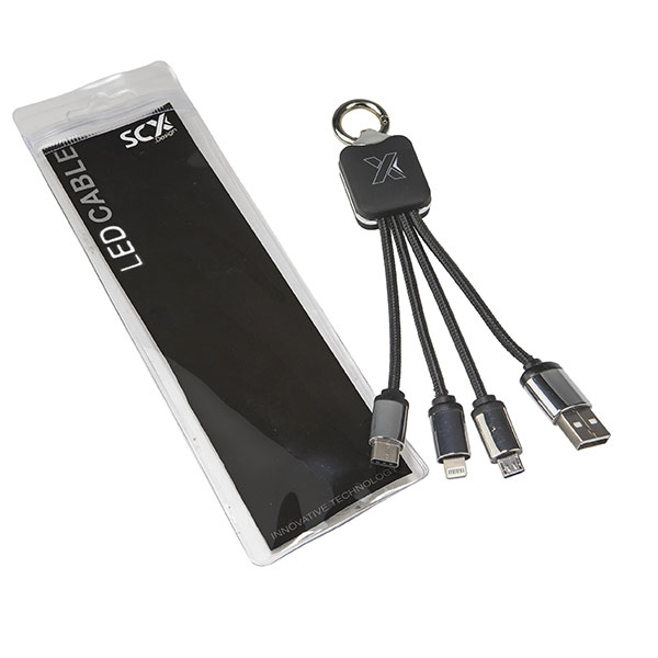 SCX light up charging cable. Made from rPET, rubber and metal. Fitted with 4 x 100mm connectors - USB/Type-C/Lightning/micro USB. 3 year warranty. Individually polybagged. Bulk packaging 200pc, 8kg. Packaging is made of recycled paper and recycled plastic