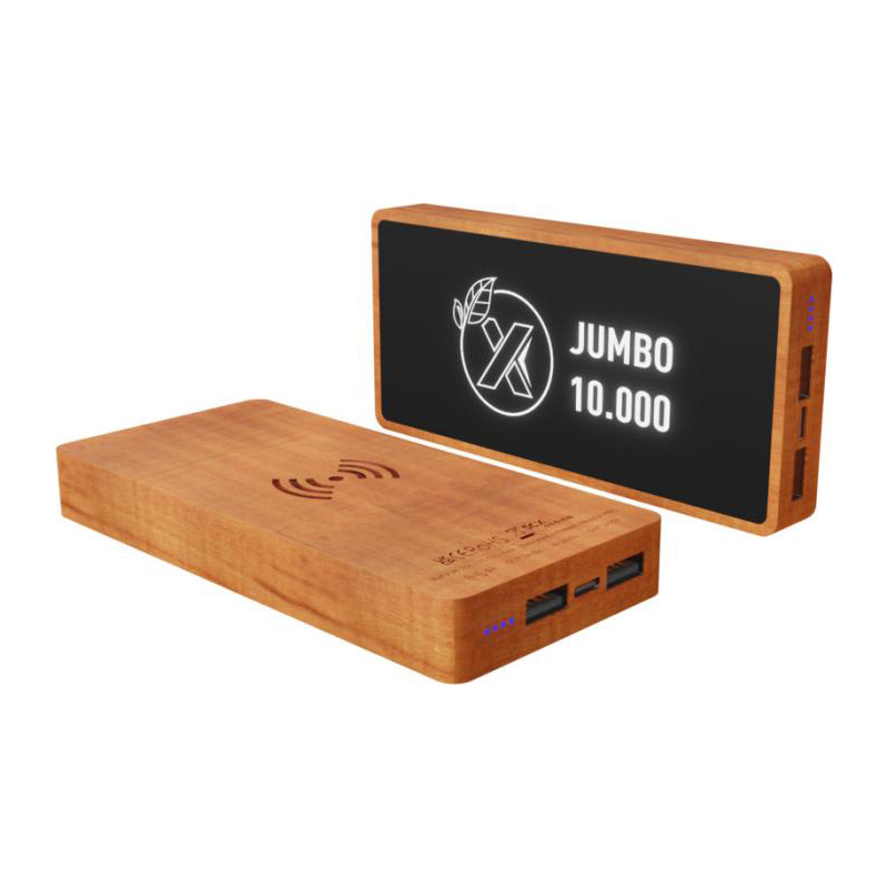 10.000 mAh wireless charging wooden powerbank with antibacterial rubber finish. The power bank features double 2A USB output and is Qi compatible. Delivered with a 3-in-1 charging cable made from recycled PET. Packed in a recycled kraft paper gift box (18.5 x 10 x 2.5 cm) with magnetic closure. Includes 3 years warranty. Wood, ABS Plastic, Rubber.